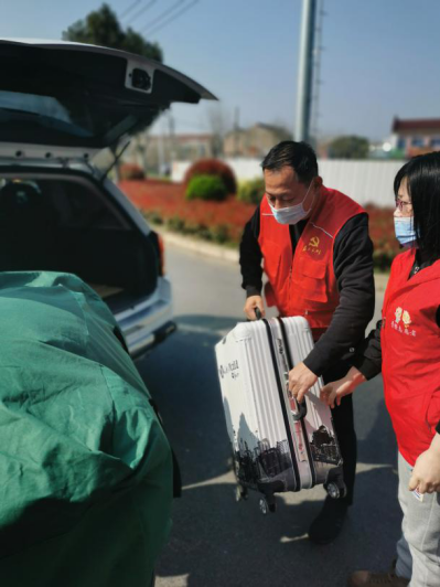 圖7-8:教師黨員和學(xué)生志愿者一起幫助學(xué)生搬運(yùn)行李返校
